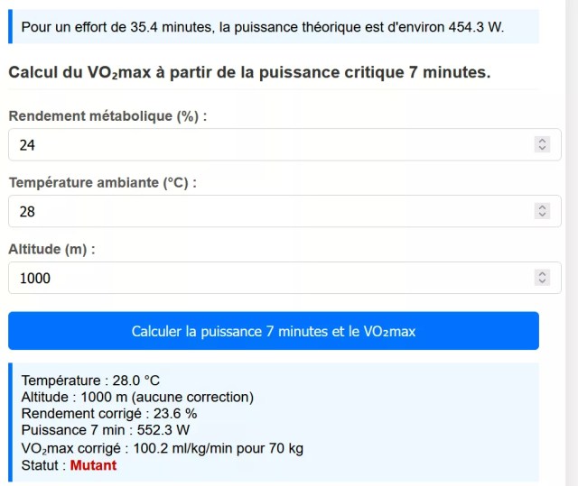 La puissance calculée est donc de 455 ± 7 watts pendant 35′. Si l’on analyse la performance avec le détecteur de performance extra physiologique1, cela nous donne un coureur de catégorie « Mutant » disposant d’un VO2max de l’ordre de 100 ml / min / kg.