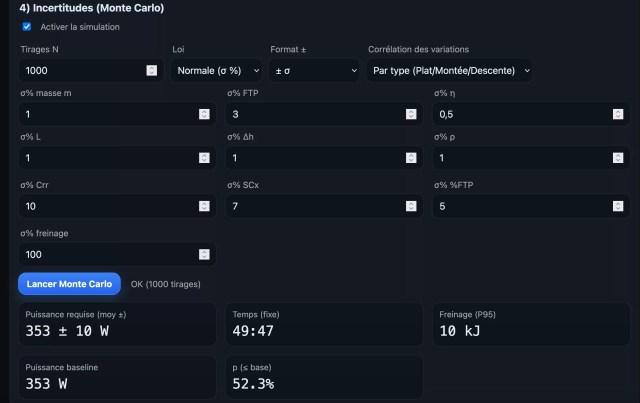 Dans le calcul final, nous évaluons l’incertitude en donnant à chaque paramètre une tolérance d’erreur en %. Cela peut aller de 0,5 % pour le rendement du vélo à 100 % pour la quantité d’énergie perdue au freinage. Pour le SCx, nous évaluons à ± 7 % nos estimations et 10 % pour le Crr (coefficient de roulement). Pour la masse totale et la masse volumique de l’air, une incertitude de 1 % est prise en compte. Enfin, les variations de puissance que nous avons paramétrées entre 70 et 110 % peuvent présenter 5 % d’incertitude. Toutefois, compte tenu du grand nombre de paramètres, l’incertitude de calcul final est de l’ordre de ± 10 watts, ce qui est très correct (soit moins de 3%)